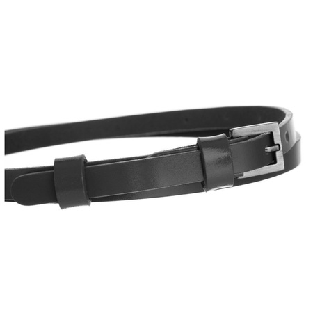 - Kultowy, wąski pasek skórzany z metalową prostokątną sprzączką. Wykonany z wysokogatunkowej skóry naturalnej, półmatowy. Posiada przymocowaną skórzaną szlufkę zabezpieczającą końcówkę. Idealny do spodni, tuniki lub sukienki.